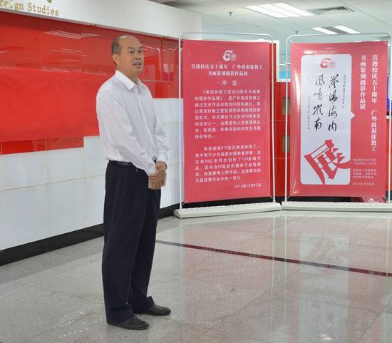 卢景辉副书记在致辞中指出,这次展览规模大、类别多、质量好,体现了很高的艺术水平、文化品味、社会价值和广外特色,是非常有特色的重大校庆活动。建校50周年之际,970位老同志的代表以书法、绘画、篆刻、摄影等形式的艺术作品体现了他们对学校深厚的感情和美好的祝福,也体现了老同志“离休不离校,退休情不改”,一直关心学校教育事业的改革、建设和发展,支持学校的人才培养工作。他代表隋广军书记、仲伟合校长,代表学校党委,对老同志对学校的关心和支持表示衷心的感谢和亲切的慰问。希望通过这次活动,让更多的师生,从艺术作品中感悟老同志爱国爱党爱校始终不一的情怀、始终坚持的信念、终身不变的本色,学习老同志的精神。