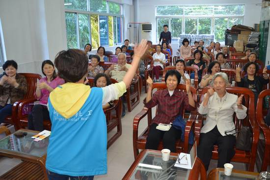在社工的带动下,老同志们做手指操