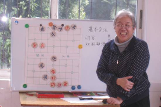 吕碧庄,2003年从我校图书馆退休,同年取得中国象棋教练员证书,后又取得国家级象棋裁判员证书,2014年11月荣获广东省第八届老年人运动会象棋项目团体和女子个人“双料”冠军。她生动形象地向大家讲解并演示了“闷宫”、“双杯敬酒”、“李代桃僵”等象棋的基本杀法;并把参加人员随机分为两组对弈,现场指导大家如何提高棋艺。