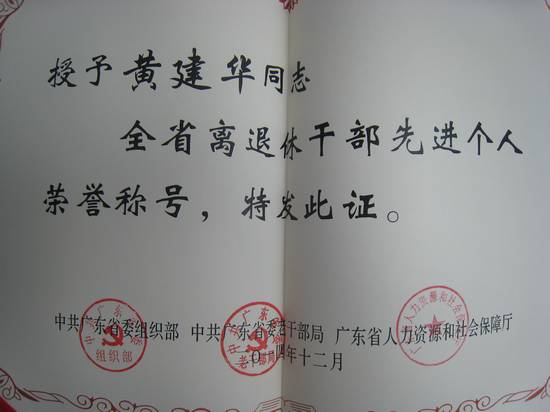 会上,省人力资源和社会保障厅副厅长陈康团代表省委宣读了《中共广东省委组织部、中共广东省委老干部局、广东省人力资源和社会保障厅关于表彰全省离退休干部先进集体和先进个人的决定》。我校黄建华教授荣获2014年度广东省离退休干部先进个人的荣誉称号。