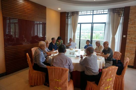 中午,离休干部和退休校领导与没有外出参观的同志们一起,在我校清雅园三楼教工餐厅联欢餐聚。离退休处处长王新贵向老干部传达了中组部和广东省委组织部关于提高离休干部护理费标准的文件,介绍了离休干部护理费调整的情况。通报了东区饭堂电梯安装、教工宿舍楼增建电梯、教工宿舍楼楼梯和拱桥台阶安装方便老同志上下的栏杆,近期将新开通在我校南门公交站发出、经过地铁站的公交车,后勤处在清雅园新设的肉菜和副食品便民售卖点、一教楼拆除重建、学校庆祝建校50年校庆筹备和征集稿件等情况。