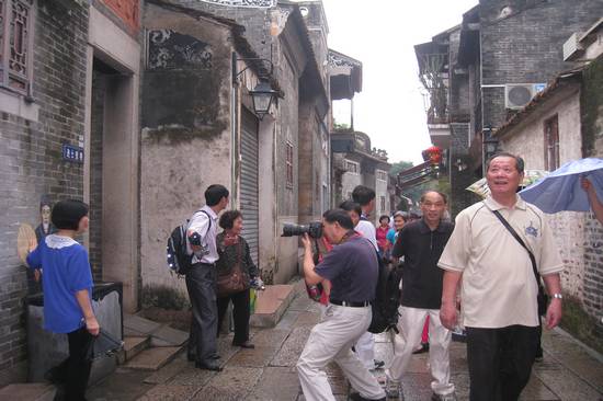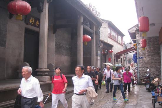 虽然天公不作美,上午参观沙湾古镇时下起了绵绵细雨,但大家仍然兴致勃勃,一路上有说有笑。撑一把小伞,雨中漫步在麻石铺就的古街巷,也别有一番情趣。独具广府乡土韵味的古镇沙湾始建于宋代,拥有800多年悠久的历史,“石阶石巷”的古村落格局保存完好,并保留了大量明、清、民国时期的古建筑,是广州保护历史文化的一个缩影。浓厚的历史文化积淀和古老的岭南民间建筑艺术引得大家不时驻足拍照留念,亦唤起不少“老广”的童年记忆。