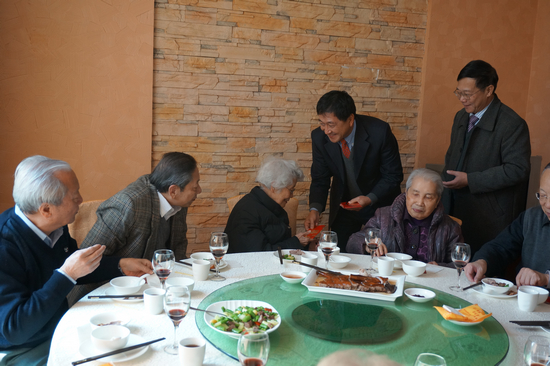随后,仲校长移步前往第六教学楼B楼103教室向30多名老领导、知名教授和享受副厅级以上待遇的离退休老干部通报学校2013年的发展情况。中午,隋广军书记、仲伟合校长在清雅园三楼教工餐厅宴请了庄明英、韩金波、桂诗春、黄建华、许友年、朱道敏、龚华基等30多名老领导、老教授。隋书记代表学校党委和行政给老领导、老教授派发了慰问红包。出席午宴的有校党委副书记陈建平,副校长方凡泉、许国彬、石佑启、何传添,党校办主任刘志军、宣传部部长胡文涛、保卫处长钟罗军、机关党委书记王秀民、团委书记谢秀兰、后勤处长杨思、离退处处长王新贵等。
