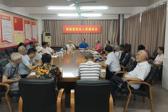 7月1日上午, 正值中国共产党建党98周年之际,我校离退休党委离休党支部在教工活动中心三楼召开全体党员大会,会议只有一个议题:讨论接收87岁离休干部高碧莲为中共预备党员。经离休党支部无记名投票表决,获全票通过。校党委组织部、宣传部相关负责人及离退休党委委员、支部书记代表、老教授代表等列席大会。